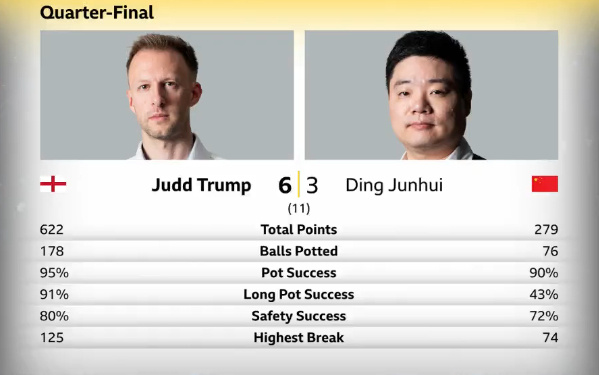 本场比赛,丁俊晖开局占据优势,连续单杆70分和74取得2比0领先。第三局特鲁姆普单杆75分扳回一局。第四局,丁俊晖单杆72分继续扩大领先优势。第五局特鲁姆普打出单杆97分追回一局。可惜丁俊晖在第六局用架杆打丢了“简单”的袋口红球,让特鲁姆普单杆53分将比分追至3比3平。
